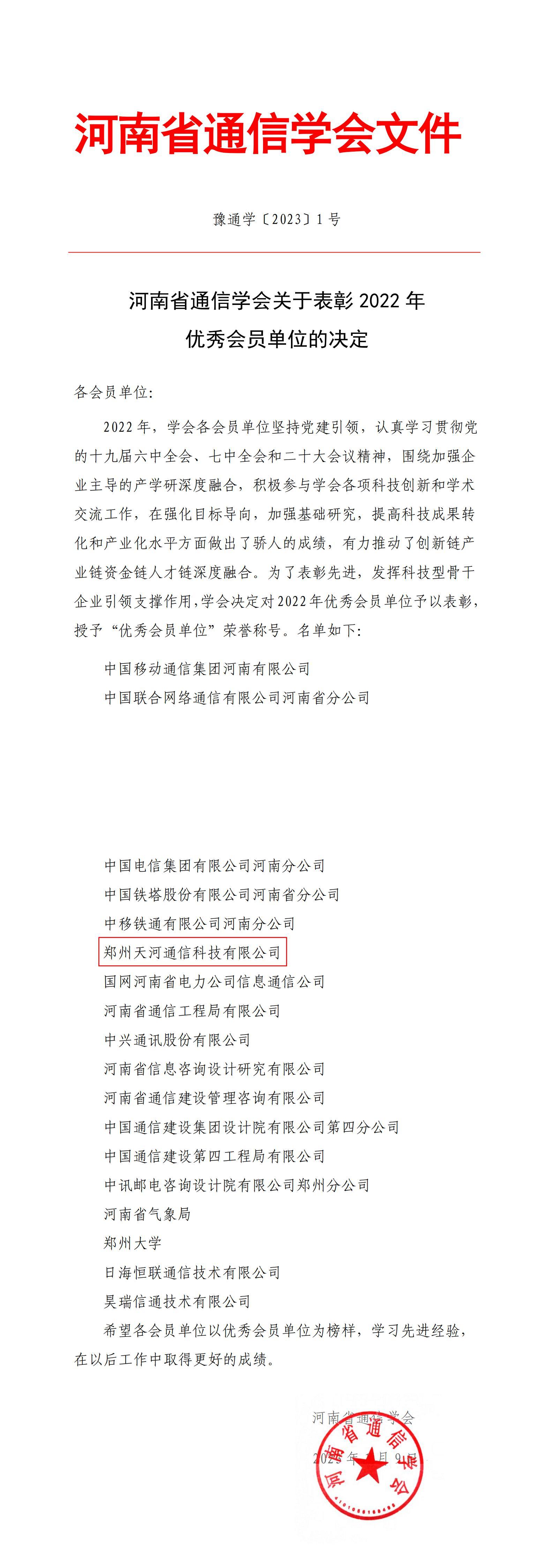 榮獲河(hé)南(nán)省通(tōng)信學會(huì)2022 年(nián)“優秀會(huì)員(yuán)單位”榮譽稱号