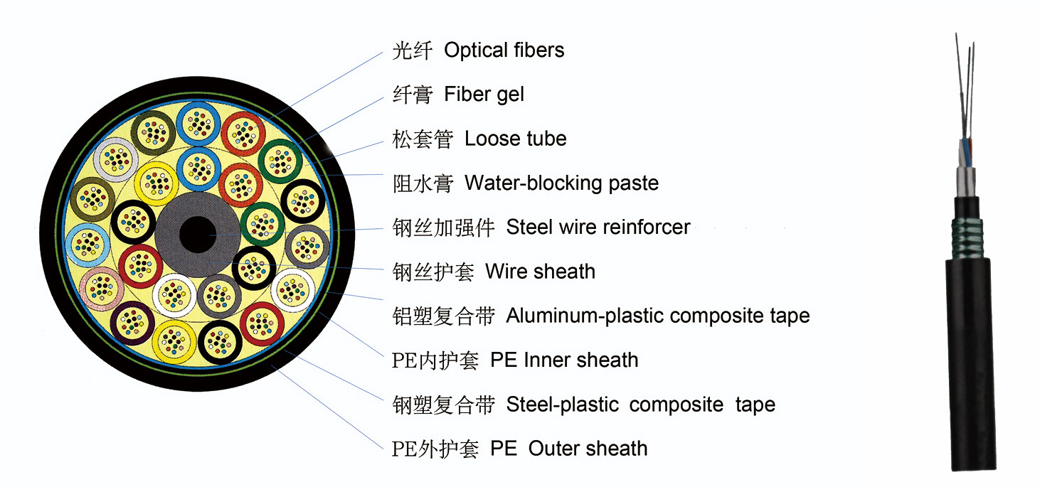 将光(guāng)纖套入高(gāo)模量的(de)聚酯材料做(zuò)成的(de)松套管中,套管內(nèi)填充防水(shuǐ)化(huà)合物(wù),光(guāng)纖有(yǒ₽u)餘長(cháng),使光(guāng)纖不(bù)受應力,纜芯的(de)中心是(shì)一(yī)根金(jīn)屬加強芯,松套管和(hé)填充繩圍繞中心加強芯絞合成緊湊的(de)圓形纜芯↑,纜芯內(nèi)的(de)縫隙充以阻水(shuǐ)填充物(wù),塗塑鋁帶-聚乙烯粘接護層成纜,雙面塗塑鋼帶縱包铠裝後擠制(zhì)聚乙烯外(wài)護套成纜。φ