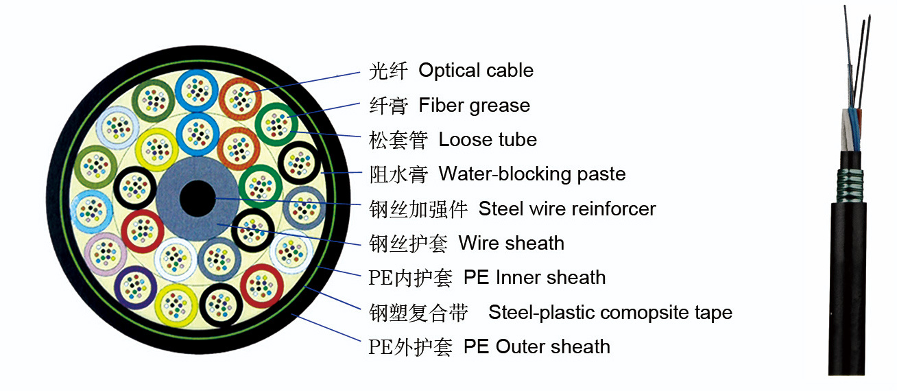 将光(guāng)纖套入高(gāo)模量的(de)聚酯材料做(zuò)成的(de)松套管中,套管內(nèi)填充防水(shuǐ)化(huà∑)合物(wù),光(guāng)纖有(yǒu)餘長(cháng),使光(guāng)纖不(bù)受應力,纜芯的(de)中心是(shì)<一(yī)根金(jīn)屬加強芯,對(duì)于某些(xiē)芯數(shù)的(de)光(guāng)纜來(lái)說(shuō),金(jīn)屬加強芯外(wài)還(hái)需擠上(shàng)一↔(yī)層聚乙烯。松套管和(hé)填充繩圍繞中心加強芯絞合成緊湊的(de)圓形纜芯,纜芯內(nèi)的(de★)縫隙充以阻水(shuǐ)填充物(wù),纜芯外(wài)擠制(zhì)聚乙烯內(nèi)護套,雙面塗塑鋼帶縱包铠裝後擠制(zhì)聚乙烯外(wài)護套成纜。