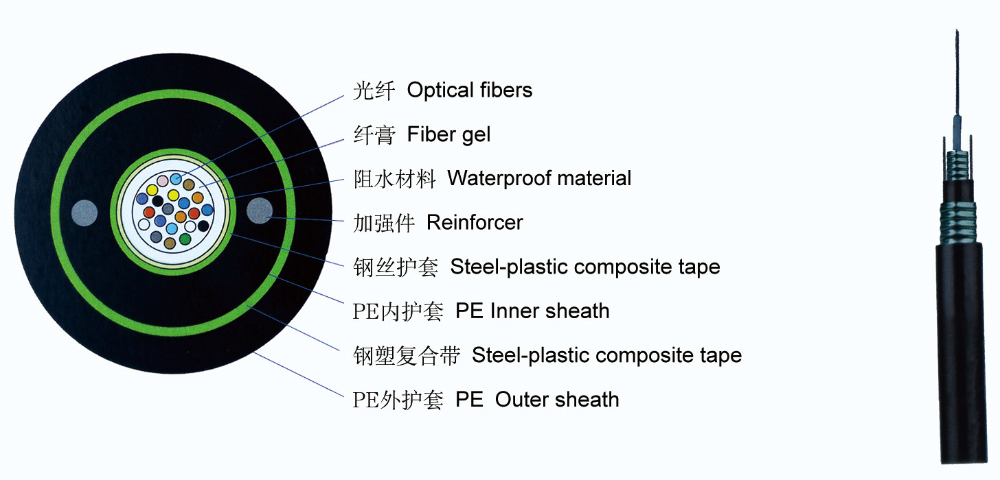 将光(guāng)纖套入由高(gāo)模量的(de)聚酯材料做(zuò)成的(de)松套管中,套管內(nèi)填充防水(shuǐ)化(huà)合物(w&ù)。松套管外(wài)用(yòng)一(yī)層雙面塑鋼帶縱包,鋼帶和(hé)松套管之間(jiān)加阻水(shuǐ)材料以保障光(guāng)纜的(de)緊湊和(hé)縱包阻水(shuǐ),兩側放(fàng)置兩根平行(xíng)鋼絲後擠制(zhì)聚乙烯內(nèi)護套,雙→面塑鋼帶縱包後擠制(zhì)聚乙烯護套成纜。