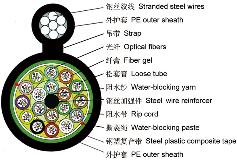 将光(guāng)纖套入高(gāo)模量的(de)聚酯材料做(zuò)成的(de)松套管中,套管內(nèi)填充防水(shu↕ǐ)化(huà)合物(wù),光(guāng)纖有(yǒu)餘長(cháng),使光(guāng)纖不(bù)受應力,纜芯的(de)中心是(shì)一(yī♣)根金(jīn)屬加強芯,松套管(和(hé)填充繩)圍繞中心加強芯絞合成緊湊的(de)圓形纜芯,纜芯內(nèi)的(de)縫隙充以阻水(shuǐ)填充物(wù),塗塑鋼縱包後,和(₹hé)鋼絞線集成到(dào)一(yī)個(gè)8字型的(de)聚乙烯護套成纜。
