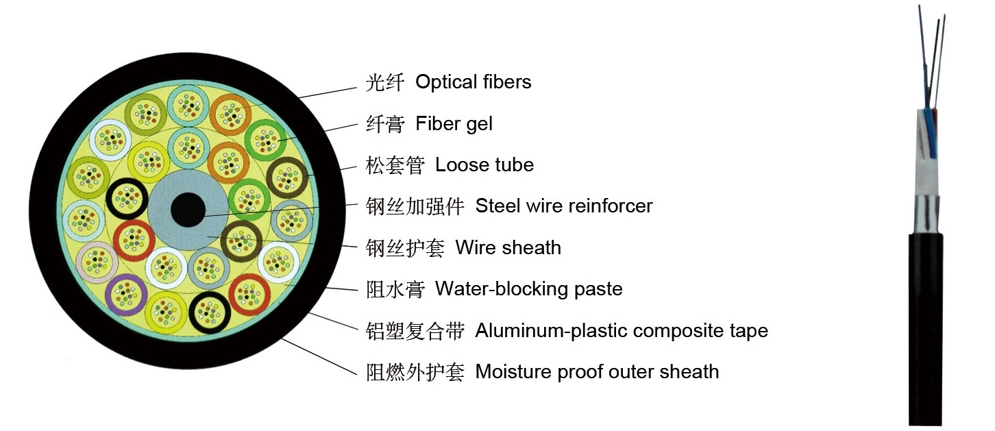 将光(guāng)纖套入高(gāo)模量的(de)聚酯材料做(zuò)成的(de)松套管中,套管內(nèi)•填充防水(shuǐ)化(huà)合物(wù),光(guāng)纖有(yǒu)餘長(cháng),使光(guāng)纖不(b©ù)受應力,纜芯的(de)中心是(shì)一(yī)根金(jīn)屬加強芯,松套管和(hé)填充繩圍繞中心加強芯絞合成緊湊的(de)圓形纜芯,纜芯內(nèi)的(de)縫隙充以阻水(shu✔ǐ)填充物(wù),塗塑鋁帶阻燃護套光(guāng)纜。