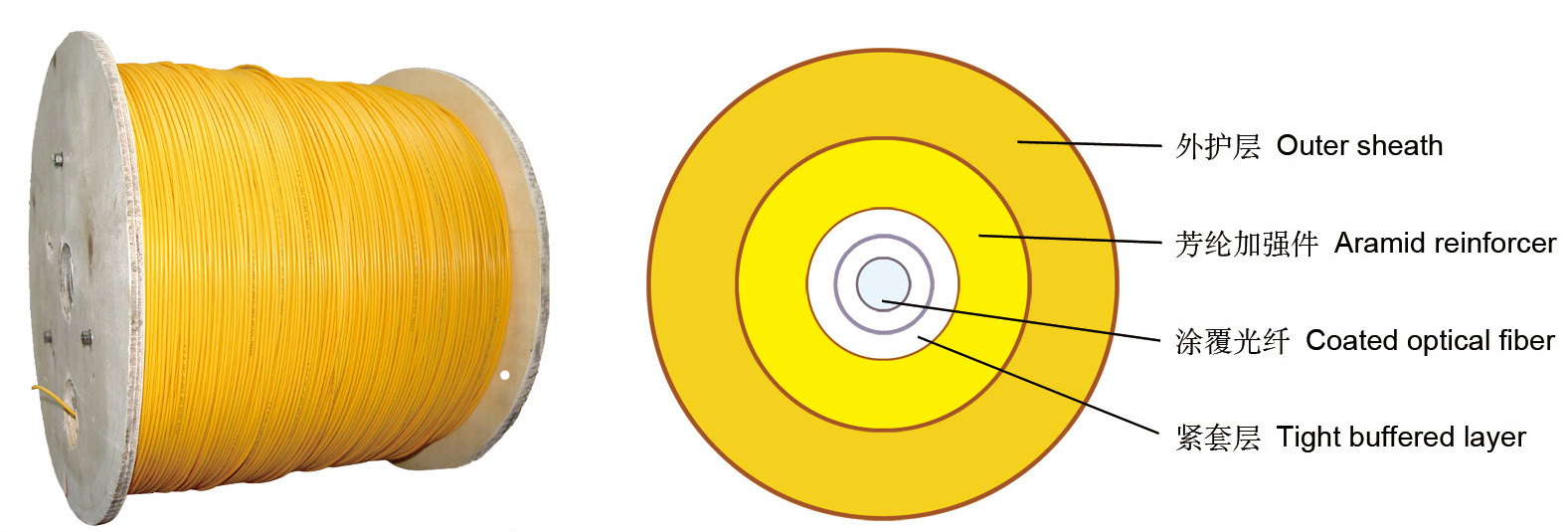 室內(nèi)光(guāng)纜的(de)結構是(shì)使用(yòng)單模或多(duō)模緊套光(guāng)纖,纜>芯內(nèi)均勻施放(fàng)起加強作(zuò)用(yòng)的(de)多(duō)股芳綸紗,再擠制(zhì)聚氯乙烯或低(dī)煙(yān)無鹵外(wài)護套而成。